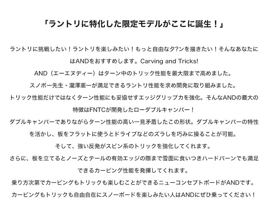 トリック性能だけではなくターン性能にも妥協せすエッジグリップカを強化。そんなANDの最大の特徴はFNTCが開発したローダブルキャンバー!