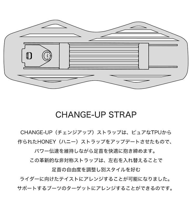 ストラップを左右入れ替えることで、足首の自由度を選ぶことが可能になり、これ一台でりトリックの幅が広がります。