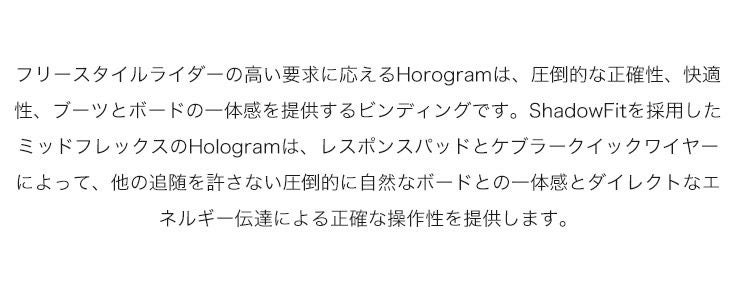 フリースタイルライダーの高い要求に応えるHorogramは、圧倒的な正確性、快適性、ブーツとボードの一体感を提供するビンディングです。