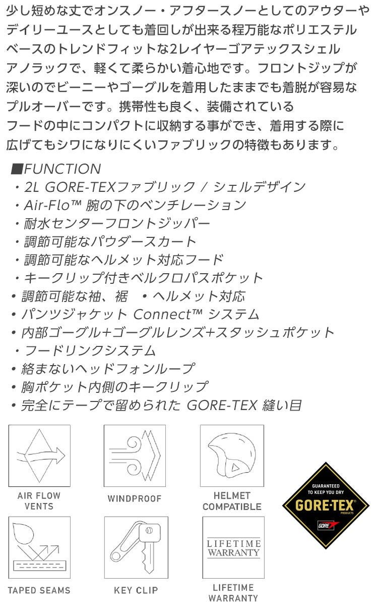 少し短めな丈でオンスノー・アフタースノーとしてのアウターやデイリーユースとしても着回しが出来る程万能なポリエステルベースのトレンドフィットな2レイヤーゴアテックスシェルアノラックで、軽くて柔らかい着心地です。