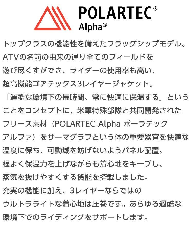 トップクラスの機能性を備えたフラッグシップモデル。ATVの名前の由来の通り全てのフィールドを遊び尽くす事のでき、ライダーの使用率も高い、超高機能ゴアテックス3レイヤージャケット。