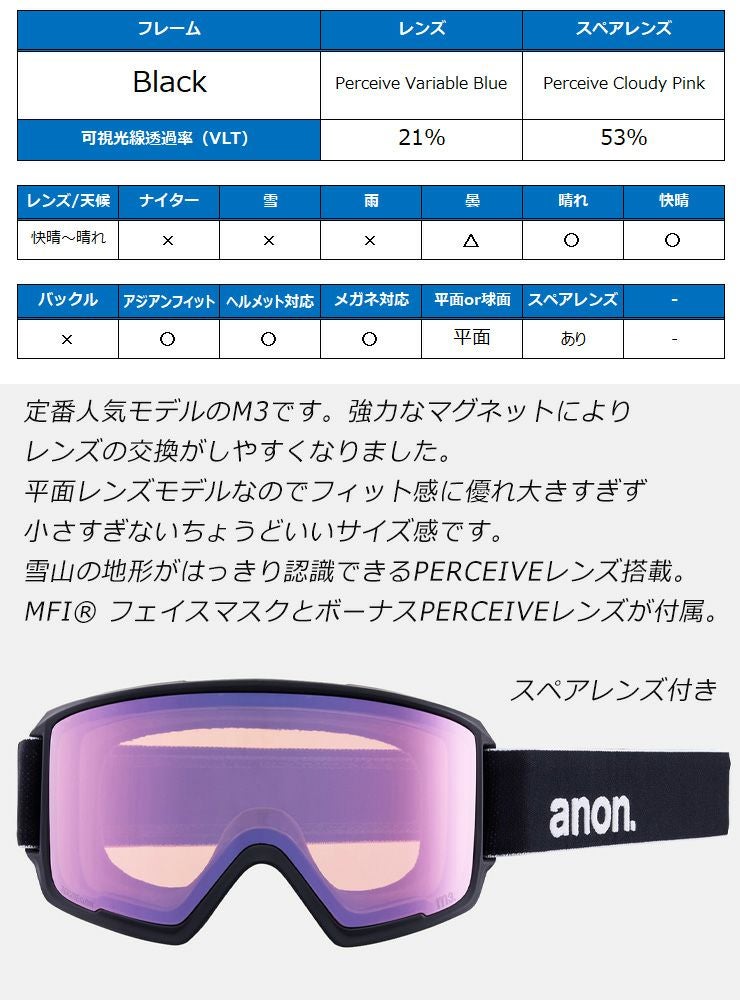 2025 anon アノン スノーボード ゴーグル M3 Low Bridge カラー: Black レンズ: Perceive Variable Blue スキー マグネット式 【acc-cp-09】