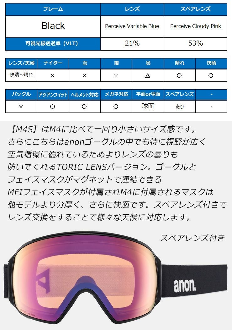 2025 anon アノン スノーボード ゴーグル M4S Toric Low Bridge カラー: Black レンズ: Perceive Variable Blue スキー マグネット式 磁石式 【acc-cp-09】