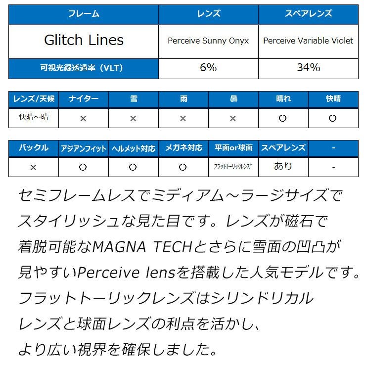 レンズが磁石で着脱可能なMAGNA TECHとさらに雪面の凹凸が見やすいPerceive lens搭載した注目のモデルです。