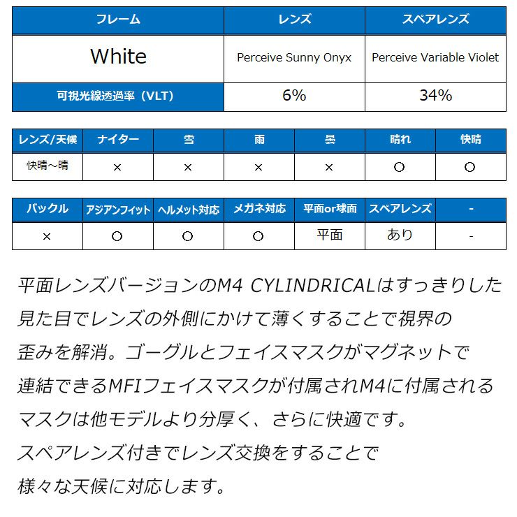 平面レンズバージョンのM4 CYLINDRICALはすっきりした見た目でレンズの外側にかけて薄くすることで視界の歪みを解消。