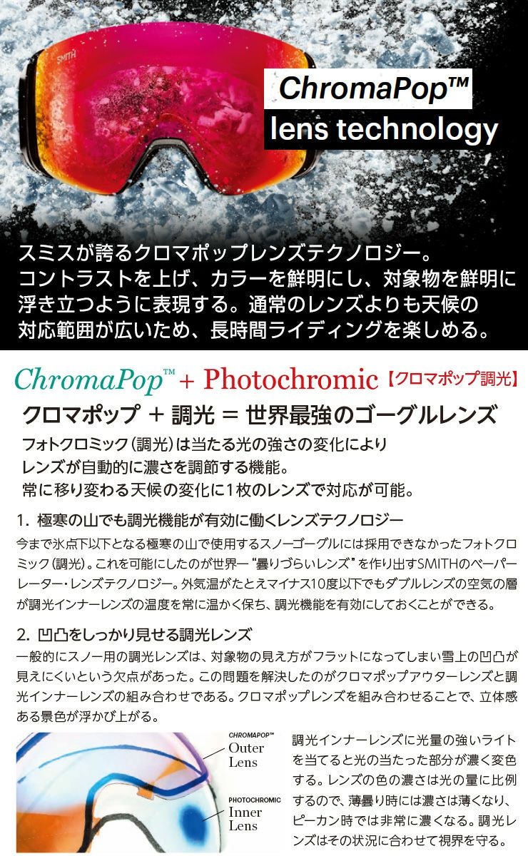 スミス史上最強テクノロジー、5倍の曇り止め加工やきれいに見えるクロマポップテクノロジーを搭載。