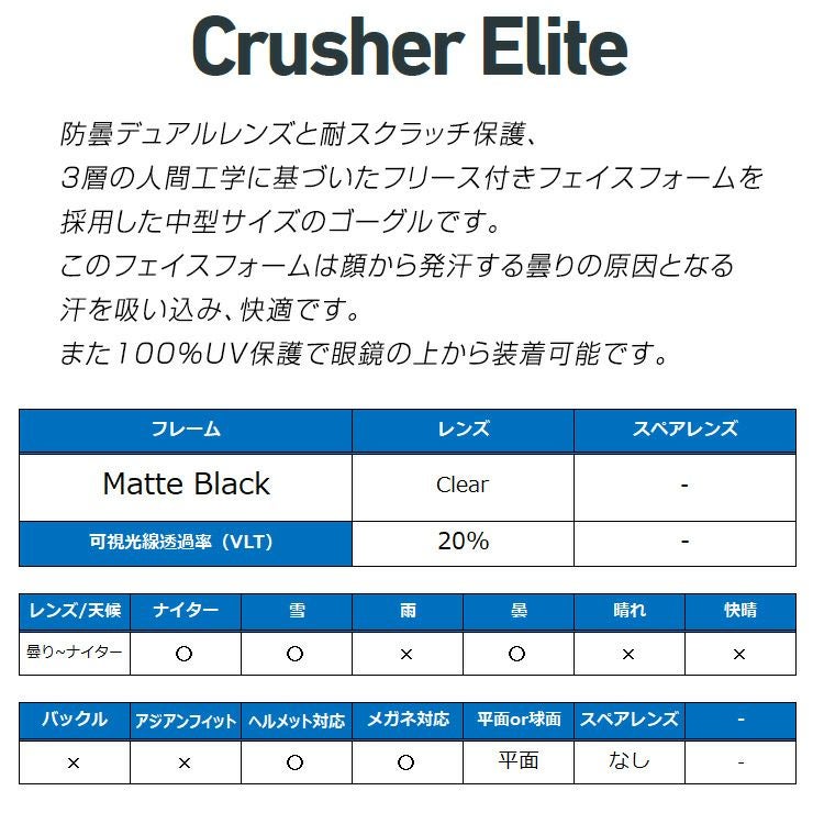 防曇デュアルレンズ、耐スクラッチプロテクション、3層の人間工学に基づいたフリース付きフェイスフォームを採用した、中型サイズのCrusher Elite。