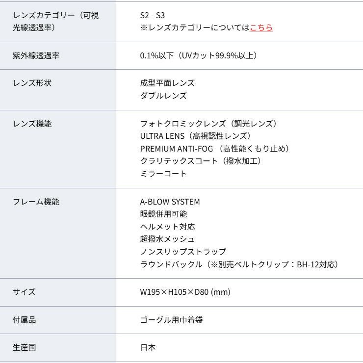 フォトクロミック(調光)レンズ、クラリテックスコート、ウルトラレンズ、プレミアムアンチフォグ、ダブルレンズ、UVカットレンズ、ヘルメット対応、眼鏡対応