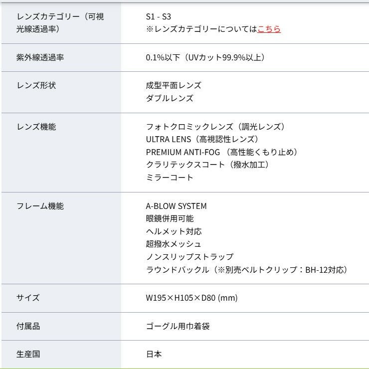 フォトクロミック(調光)レンズ、クラリテックスコート、ウルトラレンズ、プレミアムアンチフォグ、ダブルレンズ、UVカットレンズ、ヘルメット対応、眼鏡対応