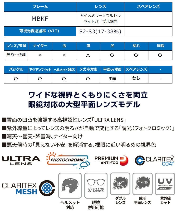 プレミアムアンチフォグ、フォトクロミック(調光)レンズ、ウルトラレンズ、クラリテックスコート、ダブルレンズ、UVカットレンズ、ヘルメット対応、眼鏡対応