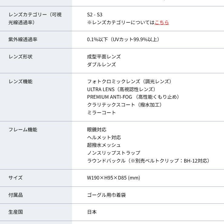 プレミアムアンチフォグ、フォトクロミック(調光)レンズ、ウルトラレンズ、クラリテックスコート、ダブルレンズ、UVカットレンズ、ヘルメット対応、眼鏡対応