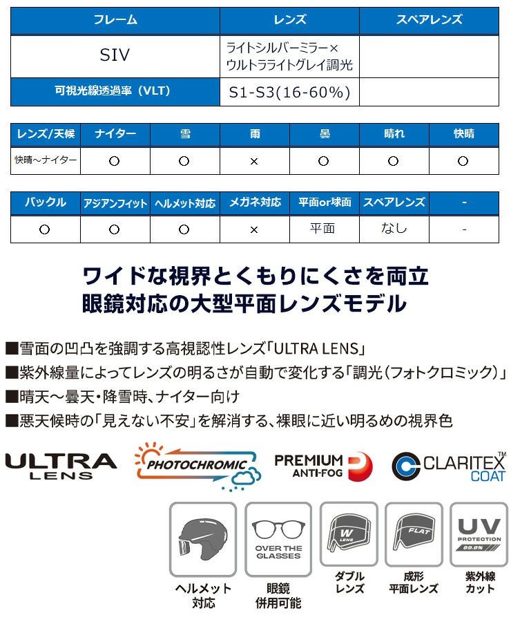 プレミアムアンチフォグ、フォトクロミック(調光)レンズ、ウルトラレンズ、クラリテックスコート、ダブルレンズ、UVカットレンズ、ヘルメット対応、眼鏡対応