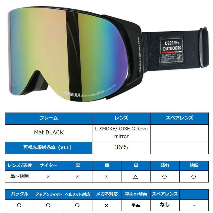 スノーボード ゴーグル DEES ディーズ FORMULA フォーミュラ Mat BLACK レンズ:L.SMOKE/ROSE.G Revo mirror スキー お買い得 スノボー DYG-2374 【acc-cp-09】