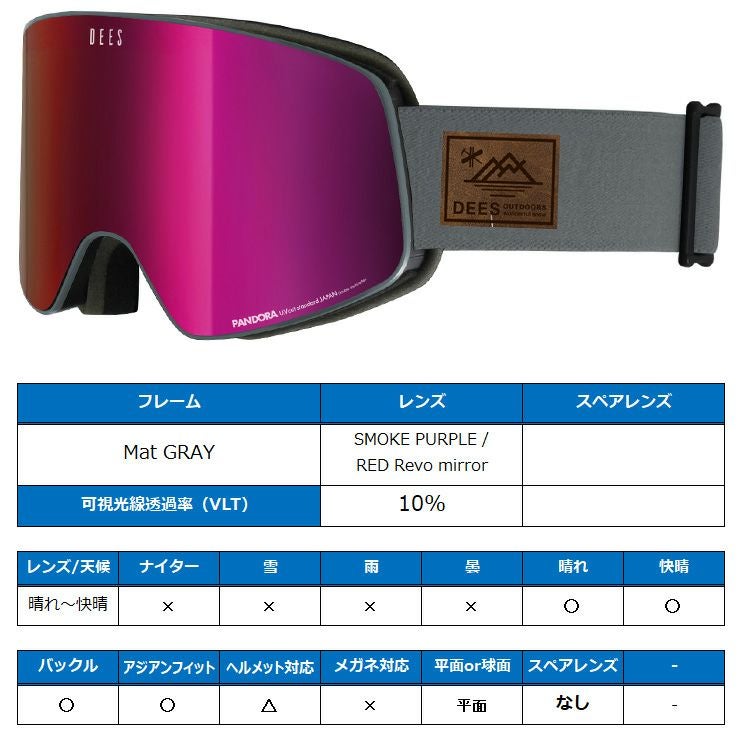 他の画像を見る スノーボードゴーグル アジアンフィット スノーボード ゴーグル DEES ディーズ PANDORA パンドラ DEG-2478-3 Mat GRAY レンズ:SMOKE PURPLE / RED Revo mirror スキー スノボー 通常販売価格 ¥ 8,250 のところ WEB価格 ¥ 6,589 税込 会員特別価格 ¥ 6,259 税込 在庫切れ 詳細を見る お気に入りに登録する