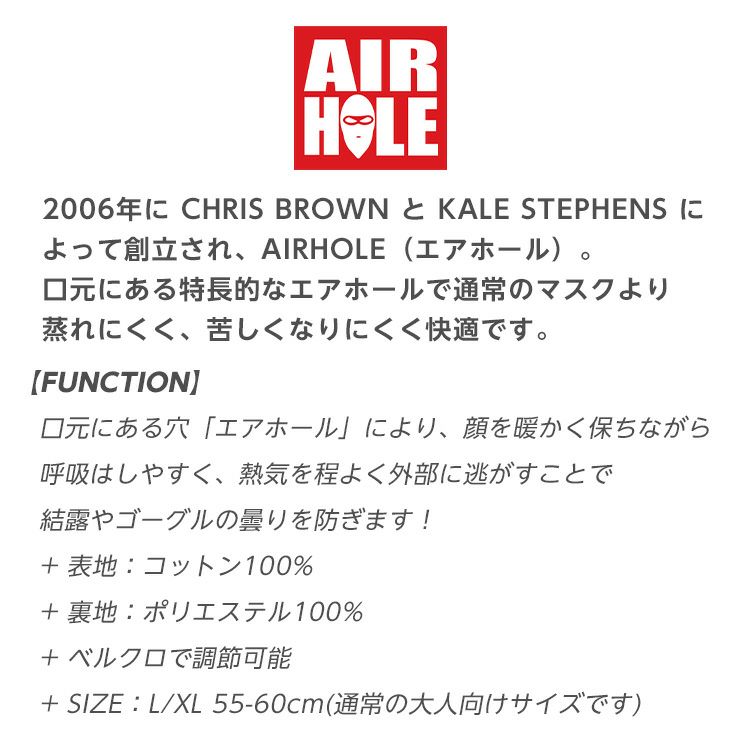 他の画像を見る 呼吸しやすい空気孔付きのマスク 【ポイントUP祭!!】AIRHOLE エアホール AIRTUBE AH14AT1 エアチューブ フェイスマスク スノーボード スキー【acc-cp-09】 通常販売価格 オープン価格 のところ WEB価格 ¥ 2,200 税込 会員特別価格 ¥ 2,090 税込 カートに入れる お気に入りに登録する