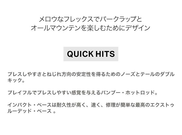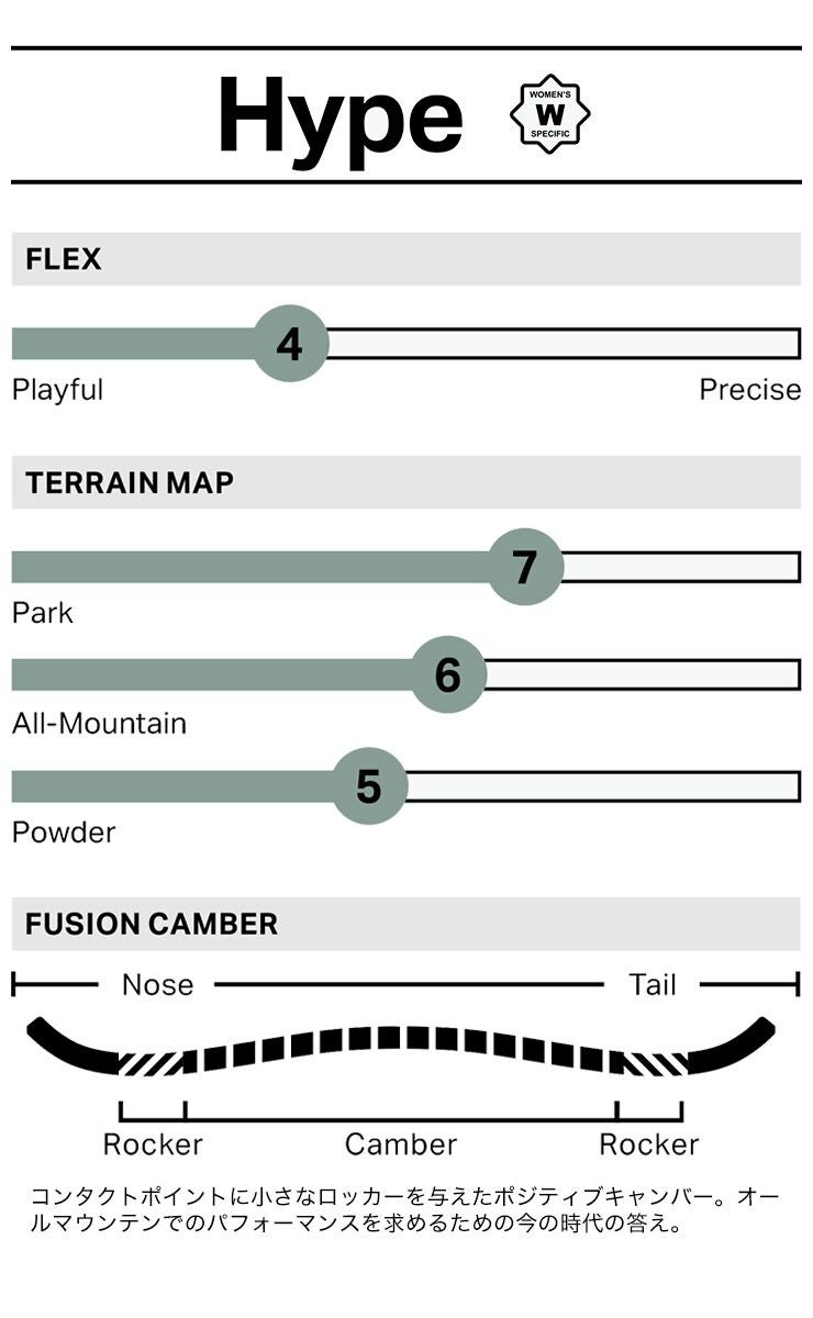 HYPEは、柔らかなフレックスでパークラップとオールマウンテンを楽しむためにデザインされたウィメンズボードです。 プレスしやすさとねじれ方向の安定性を得るためのノーズとテールのダブルキック。 プレイフルでプレスしやすい感覚を与えるバンブー・ホットロッド。 インパクト・ベースは耐久性が高く、速く、修理が簡単な最高のエクストゥルーデッド・ベース。