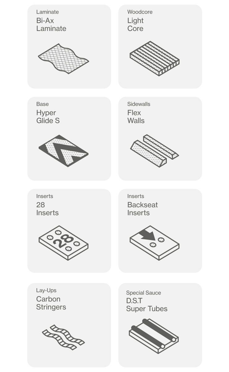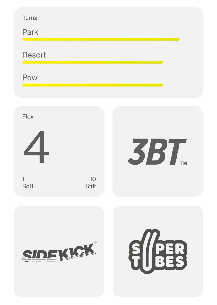 アップリフトされたエッジが、パークでの安心感を補い、ミッドソフトフレックスと組込まれたカーボン素材が、キレのあるクイックな滑りをサポートします。