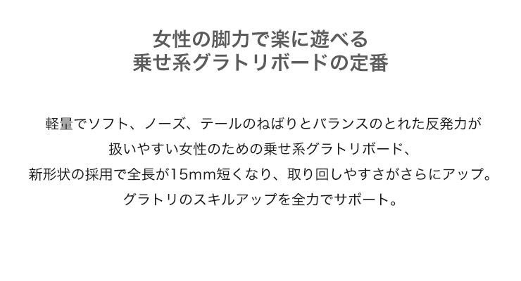 軽量でソフト、ノーズ、テールのねばりとバランスのとれた反発力が扱いやすい女性のための乗せ系グラトリボード、 新形状の採用で全長が15mm短くなり、取り回しやすさがさらにアップ。 グラトリのスキルアップを全力でサポート。