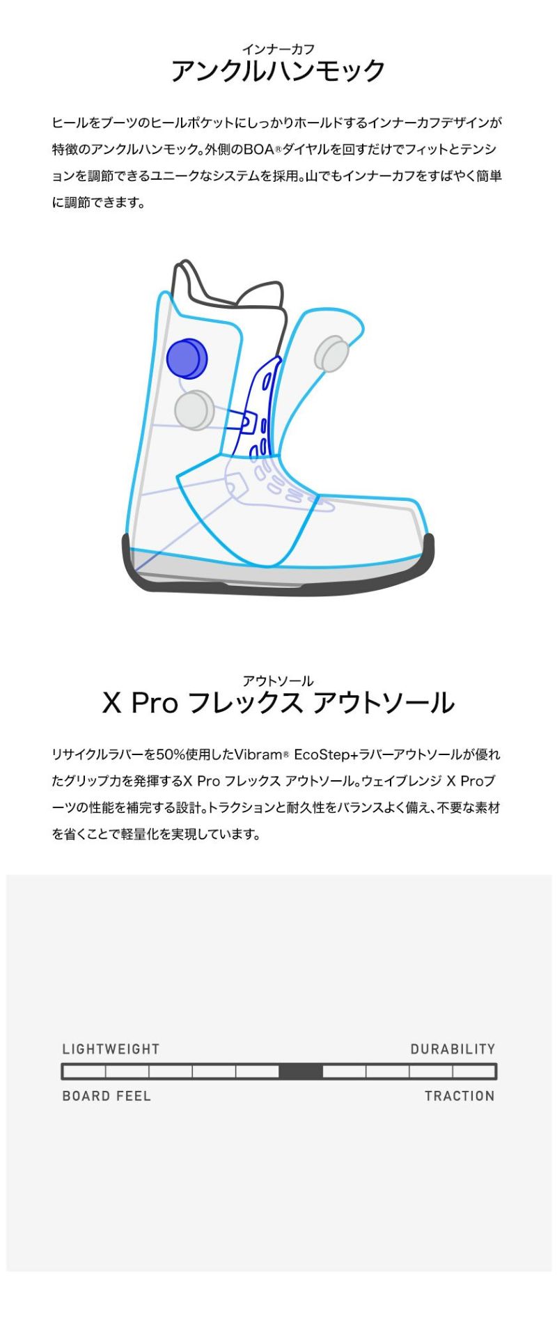 フィットを調整して、いざ出発。ウィメンズ Burton ウェイブレンジ X Pro Step OnR スノーボードブーツが、サーフィンのような軽快なライドと滑らかな動きを実現します。Burton BOAR Triple Dial PerformFit? Wrapフィットシステムで、上部、内側下部、足首の3つのゾーンを個別に調節できます。フィット感を自在に調節できる3ゾーンシステムにより、新次元の履き心地を実現したハイパフォーマンスブーツ。軽さと耐久性を両立させた高機能アウトソールが、優れたレスポンスとトラクションを実現します。Step Onしてすぐに滑り出せるシステムを搭載したこのブーツがあれば、山のどこにいてもハイパフォーマンスなライディングが楽しめます。