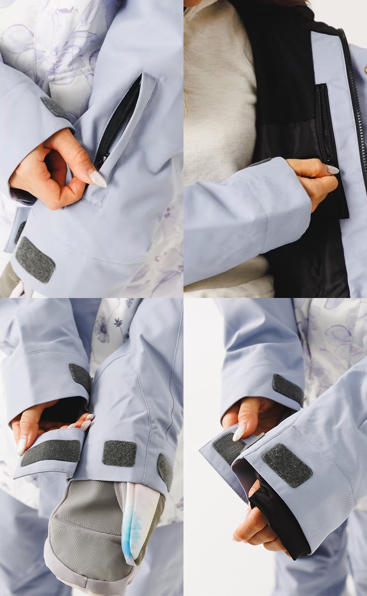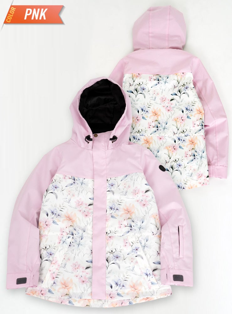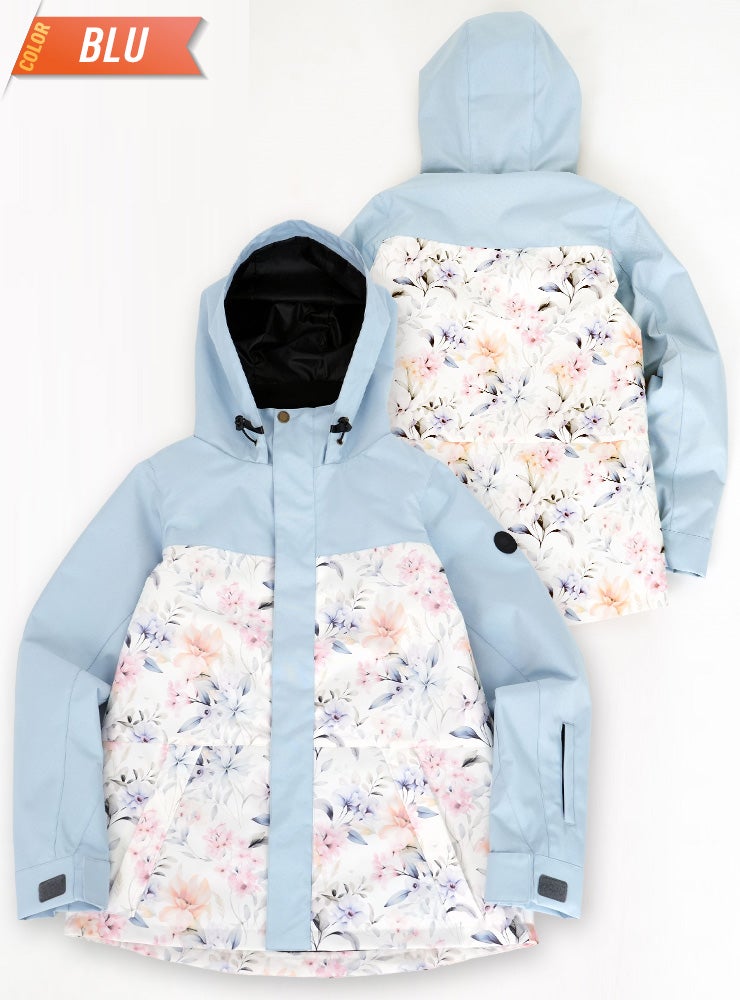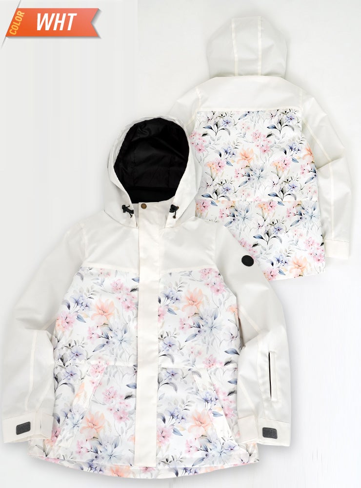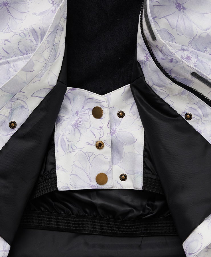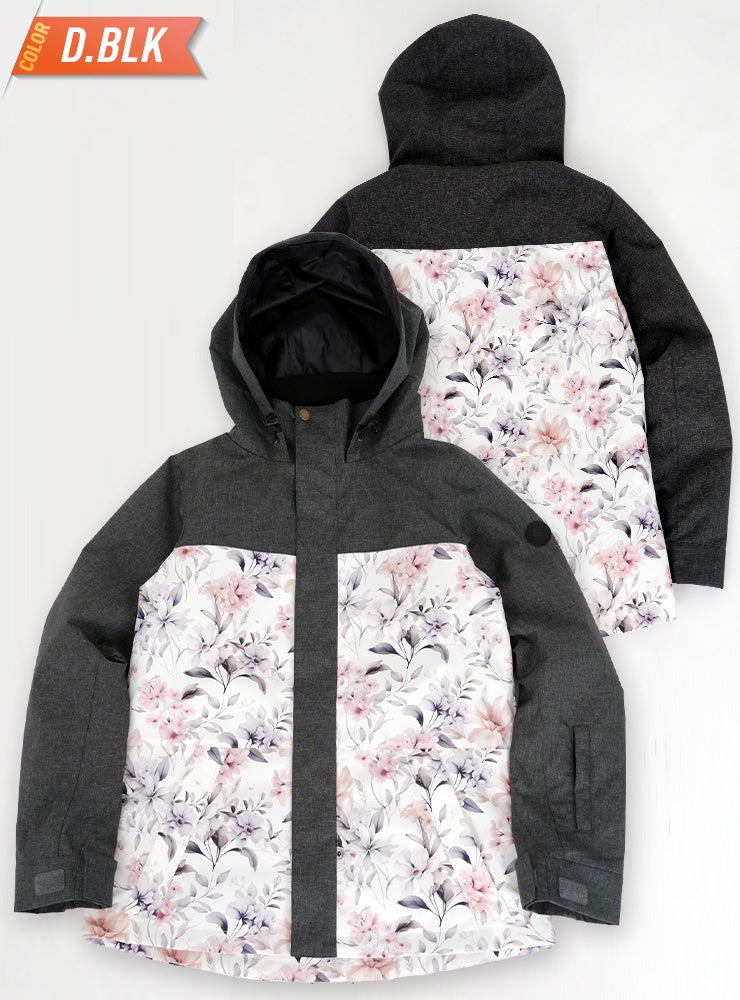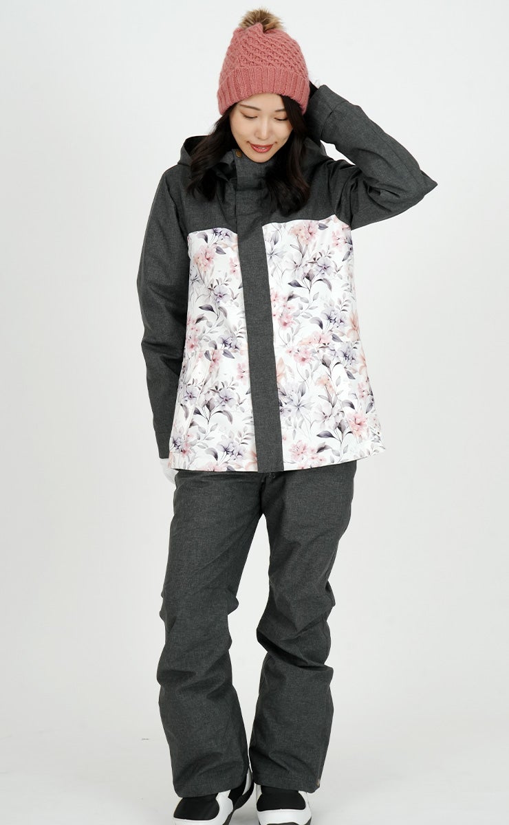 単色からの淡い花柄が女性らしいデザインで防寒対策も安心なスノーボ-ドジャケットです。