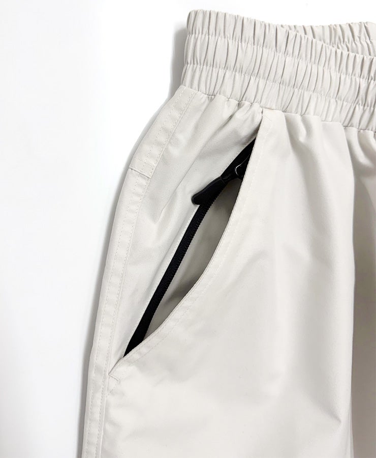 生地表面が柔らかなピーチスキン加工(桃の表面)生地の構造がスリーレイヤー(三層)で、撥水、防水、透湿機能、裏地ヒザ部分、後ヒップ部分はフリース生地。