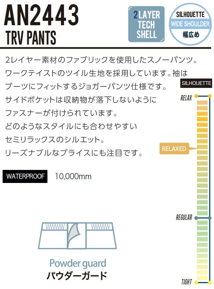 他の画像を見る 2025 撥水軽量パンツ 24-25 ANTHEM アンセム TRV PANTS TRVパンツ スノーボード スキー ウェア 通常販売価格 ¥ 20,680 のところ WEB価格 ¥ 18,612 税込 会員特別価格 ¥ 17,681 税込 在庫切れ カートに入れる お気に入りに登録する