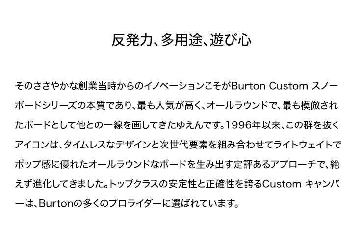そのささやかな創業当時からのイノベーションこそがBurton Custom スノーボードシリーズの本質であり、最も人気が高く、オールラウンドで、最も模倣されたボードとして他との一線を画してきたゆえんです。1996年以来、この群を抜くアイコンは、タイムレスなデザインと次世代要素を組み合わせてライトウェイトでポップ感に優れたオールラウンドなボードを生み出す定評あるアプローチで、絶えず進化してきました。トップクラスの安定性と正確性を誇るCustom キャンバーは、Burtonの多くのプロライダーに選ばれています。