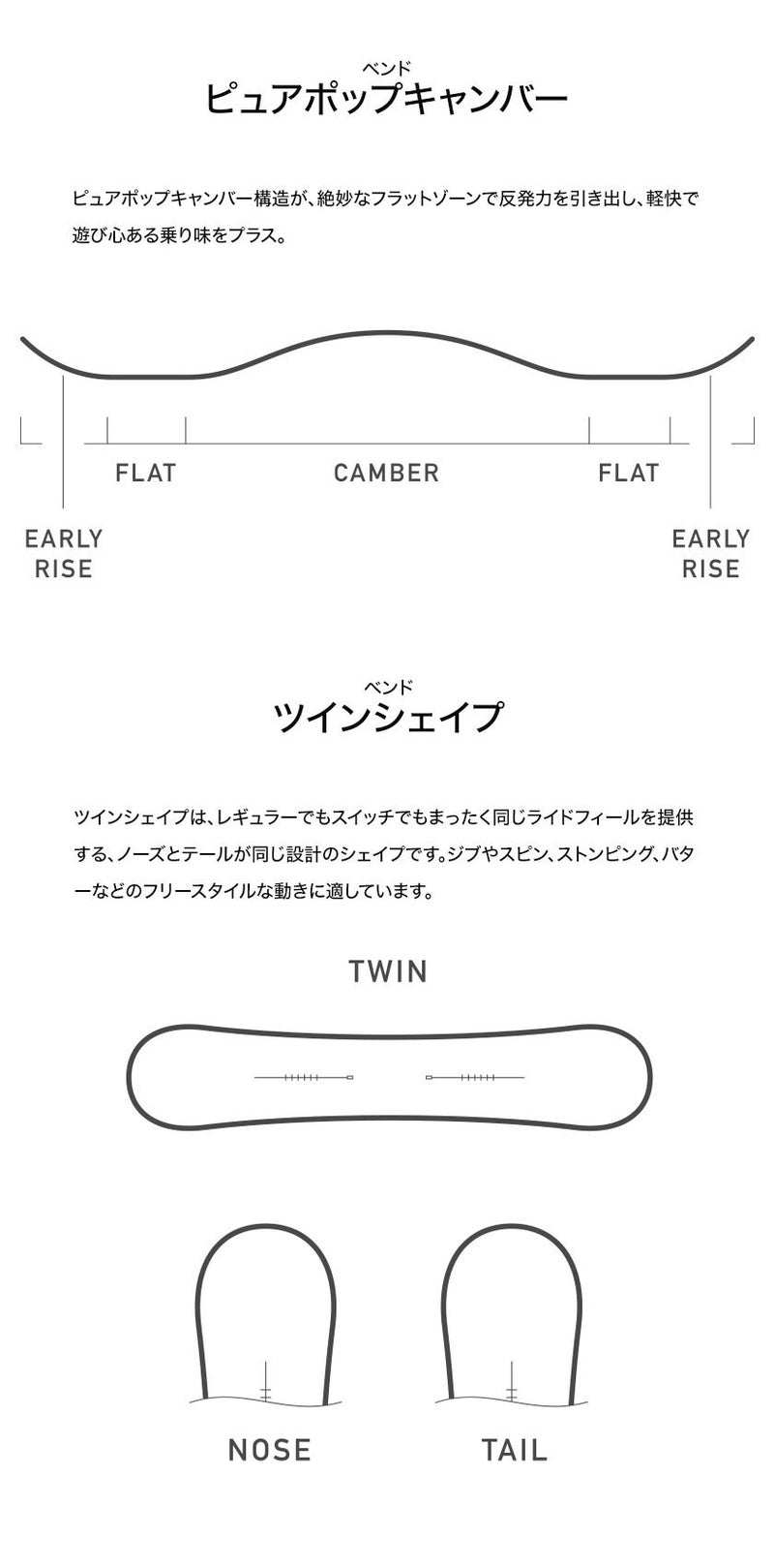 オールマウンテン スノーボード。 ディープスノーでもパークでもライディングを楽しめるパワーと反発力、浮力と安定感を提供するトゥルーツイン。