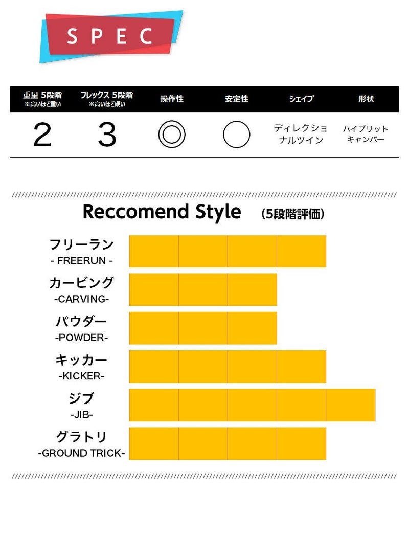 柔らかいフレックスと扱いやすいキャンバープロファイルはどのレベルのライディングであっても新しいことにチャレンジできる安心感を与えれくれることでしょう。