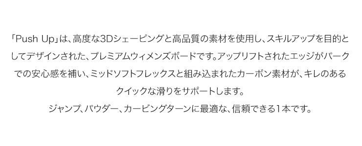 「PushUp」は、高度な3Dシェーピングと高品質の素材を使用し、スキルアップを目的としてデザインされた、プレミアムウイメンズボードです。
