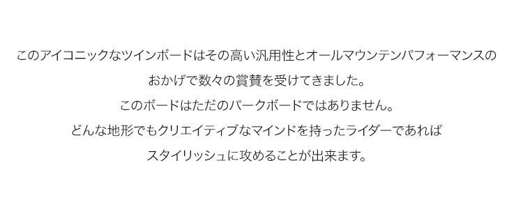 このアイコニックなツインボードはその高い汎用性とオールマウンテンパフォーマンスのおかげで数々の賞賛を受けてきました。