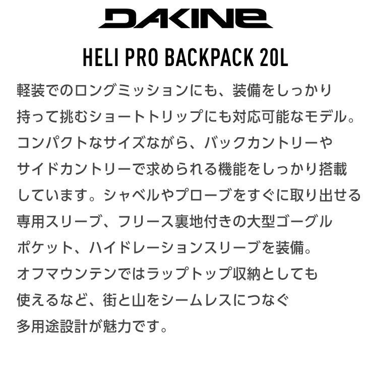 2026 DAKINE ダカイン HELI PRO BACKPACK 20L ヘリプロ バックパック 20L スノーボード スキー バックカントリー ザック サイドカントリー リュック