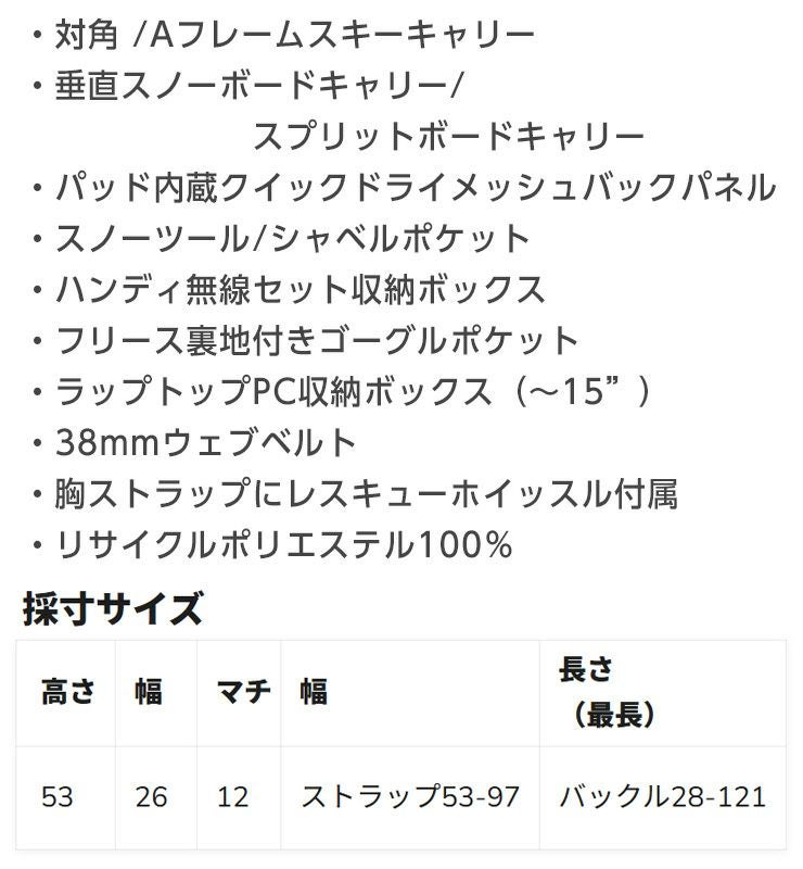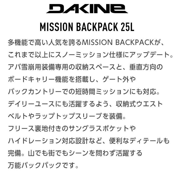 多機能で高い人気を誇るMISSION BACKPACKが、これまで以上にスノーミッション仕様にアップデート。アバ雪崩用装備専用の収納スペースと、垂直方向のボードキャリー機能を搭載し、ゲート外やバックカントリーでの短時間ミッションにも対応します。デイリーユースにも活躍するよう、収納式ウエストベルトやラップトップスリーブを装備。フリース裏地付きのサングラスポケットやハイドレーション対応設計など、便利なディテールも完備。山でも街でもシーンを問わず活躍する万能バックパックです。
