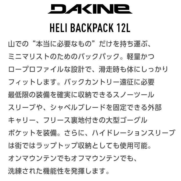 山での“本当に必要なもの”だけを持ち運ぶ、ミニマリストのためのバックパック。軽量かつロープロファイルな設計で、滑走時も体にしっかりフィットします。バックカントリー遠征に必要最低限の装備を確実に収納できるスノーツールスリーブや、シャベルブレードを固定できる外部キャリー、フリース裏地付きの大型ゴーグルポケットを装備。さらに、ハイドレーションスリーブは街ではラップトップ収納としても使用可能。オンマウンテンでもオフマウンテンでも、洗練された機能性を発揮します。