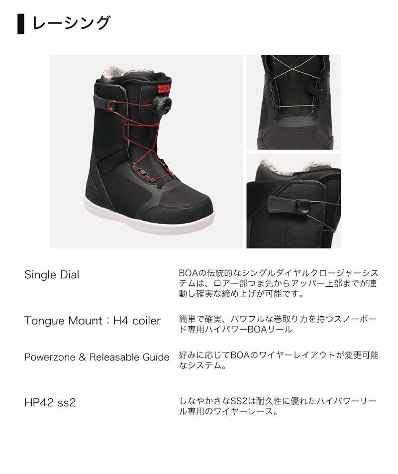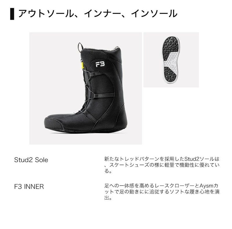 シングルボアながら、クイックリリースとパワーゾーンがイージーでスピーディーなフィッティング感を提供します。 インナーは新設計F3インナーで履き心地が向上。 足への一体感を高めるレースクローザーとAsymカットで足の動きにに追従するソフトな履き心地を演出。 BOAの伝統的なシングルダイヤルクロージャーシステムは、ロアー部つま先からアッパー上部までが連動し確実な締め上げが可能です。 新たなトレッドパターンを採用したStud2ソールは、スケートシューズの様に軽量で機動性に優れています。