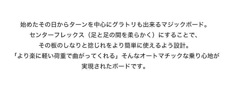 「より楽に軽い荷重で曲がってくれる」そんなオートマチックな乗り心地が実現されたボードです。