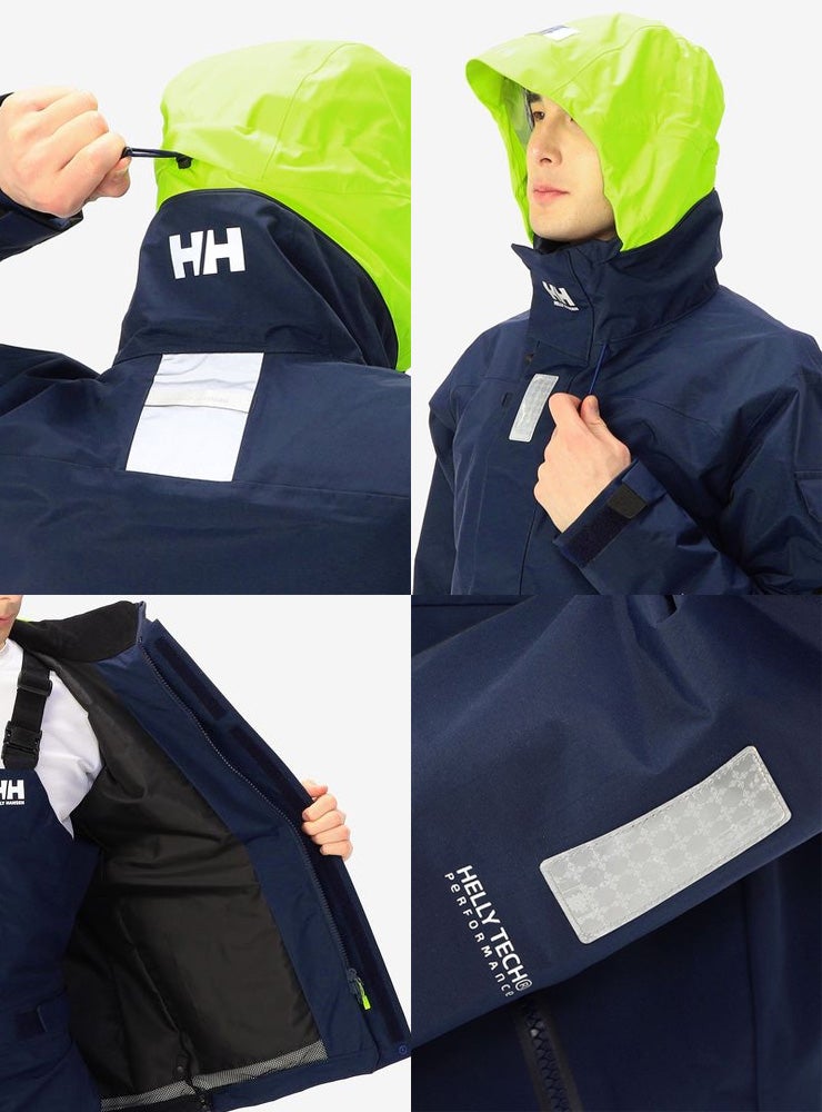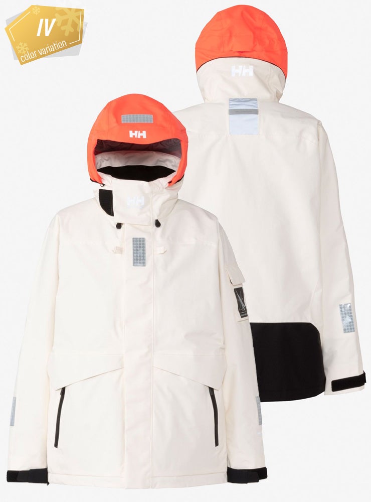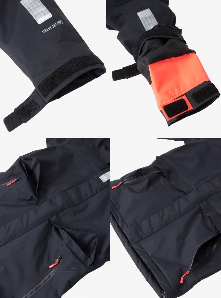 袖口はダブルカフで気密性をもたせ、水の浸入を軽減しています。 フラッシュイエローやフラッシュオレンジを配色したフードや、SOLAS条約(海上人命安全条約)に準じたリフレクトサイトのワッペンを設けることで、海上での視認性を高めています。