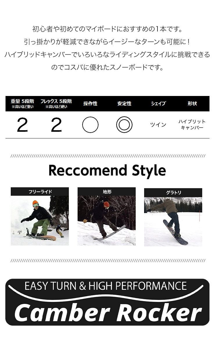 ハイブリッドキャンバーでいろいろなライディングスタイルに挑戦できるのでコスパに優れたスノーボードです。