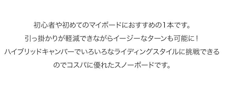 ハイブリッドキャンバーでいろいろなライディングスタイルに挑戦できるのでコスパに優れたスノーボードです。