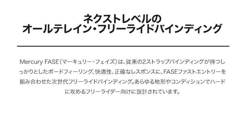 Mercury FASE(マーキュリー・フェイズ)は、従来の2ストラップバインディングが持つしっかりとしたボードフィーリング、快適性、正確なレスポンスに、FASEファストエントリーを組み合わせた次世代フリーライドバインディング。