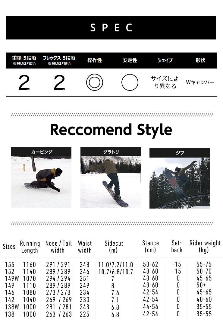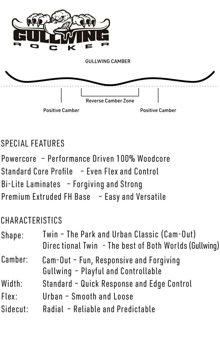 日本人に合ったスペックに調整されたこの日本限定ボードは、低-中速で扱いやすいようにソフトフレックスに設定し、ルーズな乗り心地とレスポンスを併せ持つガルウィングキャンバーを採用。