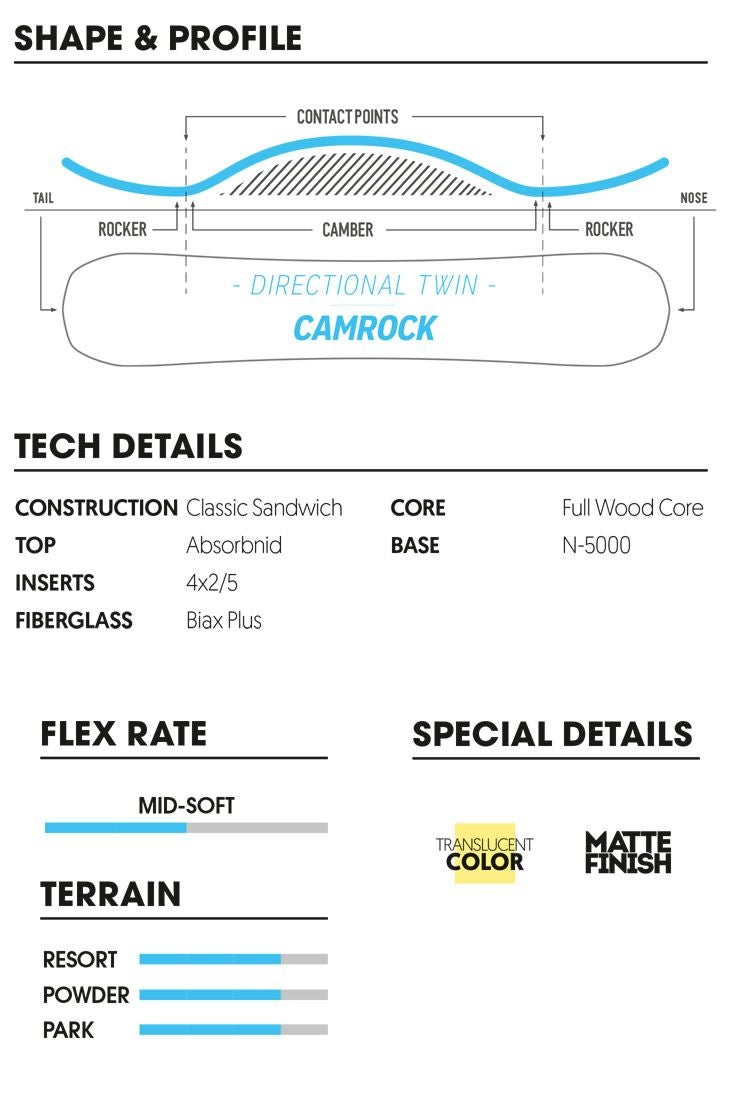 このスノーボードの心臓部はフルレングスのポプラコアで、耐久性を高めるためにブナのストリンガーが使用されている。