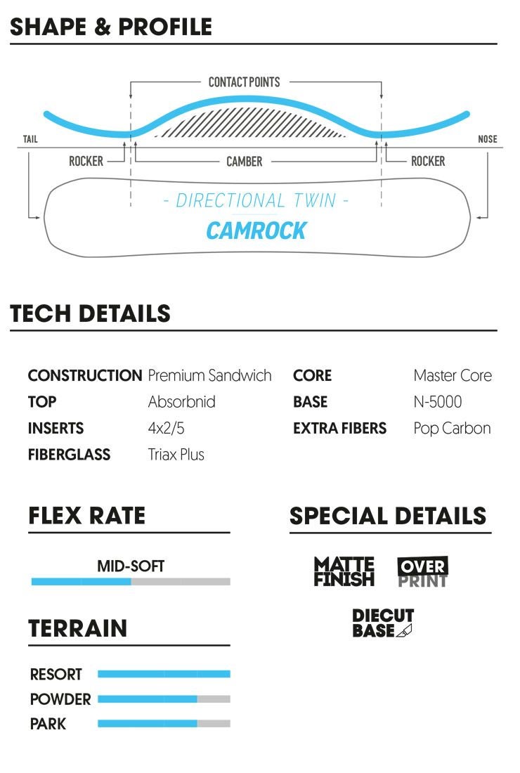 雪山全体をくまなく楽しみたい人に最適! 滑走メインでトリックも楽しめるオールラウンドボード。 柔軟性と反応のバランスが良く、中高速で遊ぶのに適したフレックス。 高速滑走でも安定感があり、幅広いライディングスタイルに対応。 側面から見るとボードの中央が浮いているアーチ型の形状で、エッジのグリップ力・反発力が高く、ターンの安定感があり高いジャンプが期待できる!