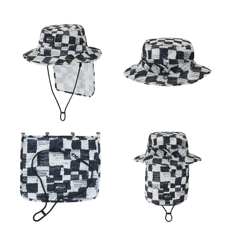 水や雨の重さでつばが下がらないよう視界を安定させるブリム前面のぺフ芯仕様で、首後ろの日焼けを防止する垂れとあご紐付き。撥水加工の軽量ポリエステル/ナイロン素材で、通気性の良いベンチレーション構造のため、ビーチやプールなどのウォーターアクティビティをはじめとした屋外のアウトドアシーンや梅雨時期にもベストマッチなアイテムです。フックでスマートに取外し可能な垂れは、表面のデザインに影響しない仕様にアップデート。あご紐も取外して使用できるので、汎用性の高さも特徴のベストセラー多機能プロダクトです。カラーはCHECKER、NAVY、BLUE (全カラー UV CUT UPF50+)の3色展開で、SATURNロゴのネームが際立っています。