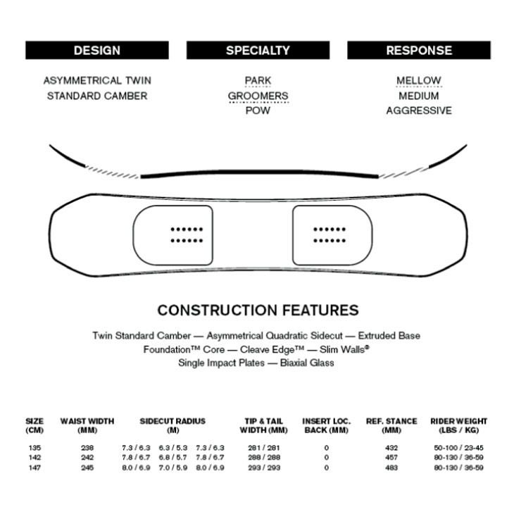 Twin Standard Camberシェイプはエッジの引っ掛かりを軽減することでスムーズなターンをアシスト。