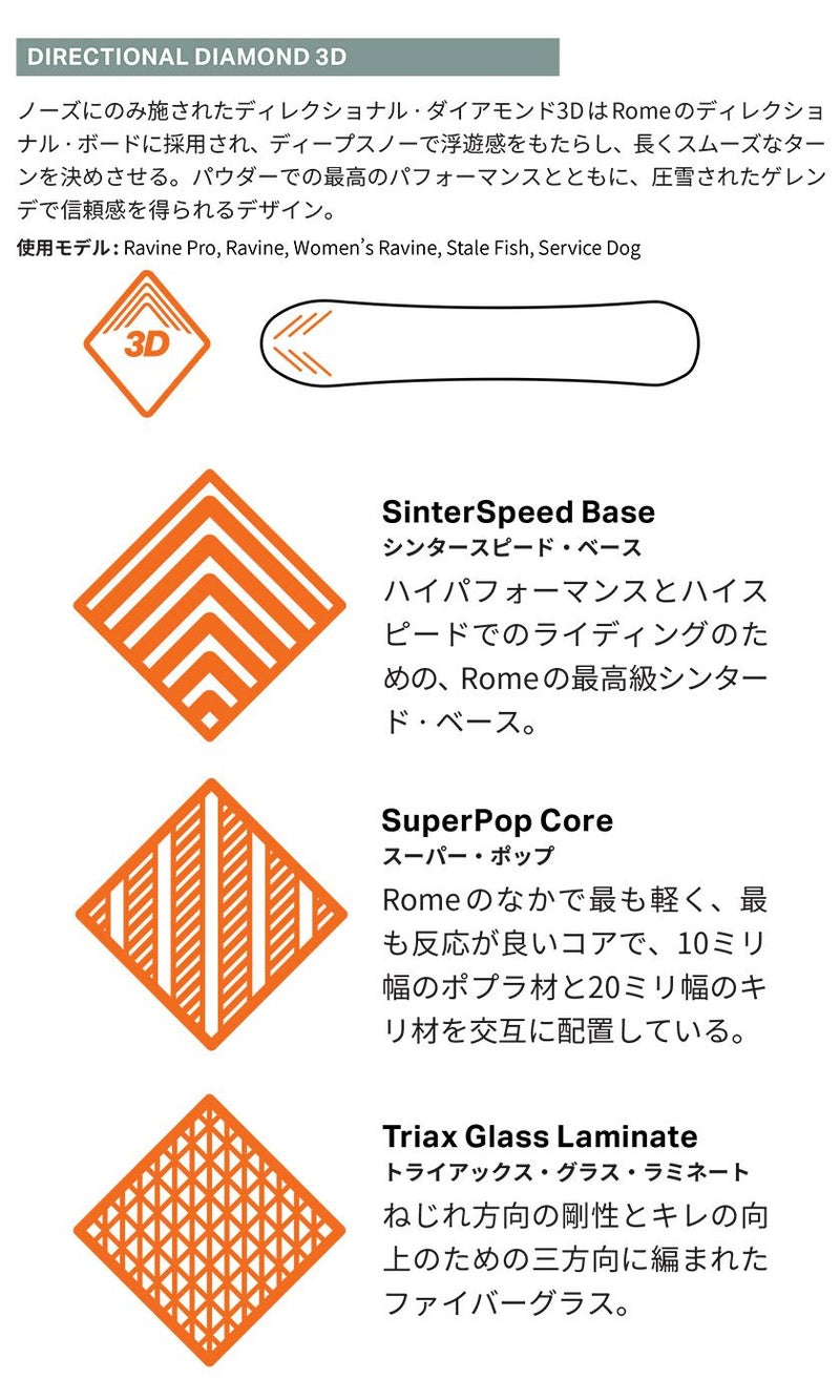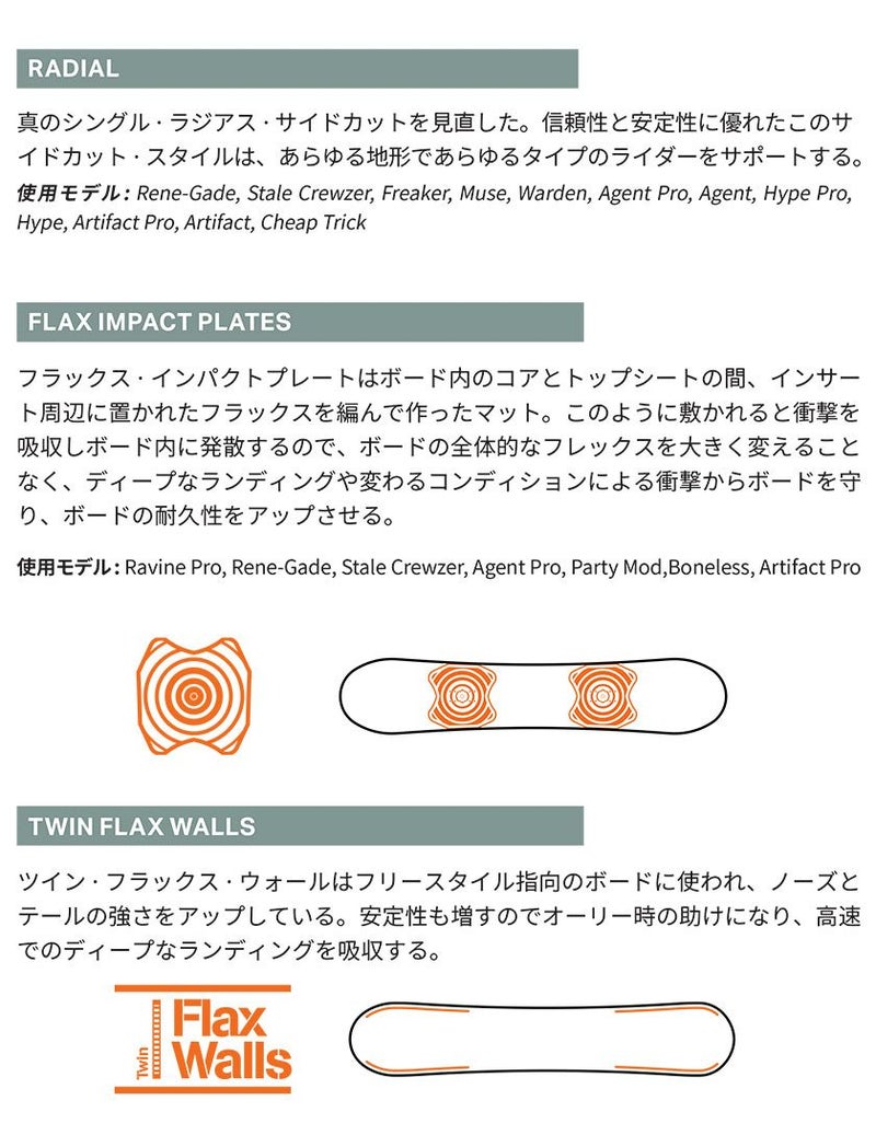高い反発力と安定性を両立するキャンバー構造で、ビックジャンプやハイスピードのライディングに進化を発揮する一本。
