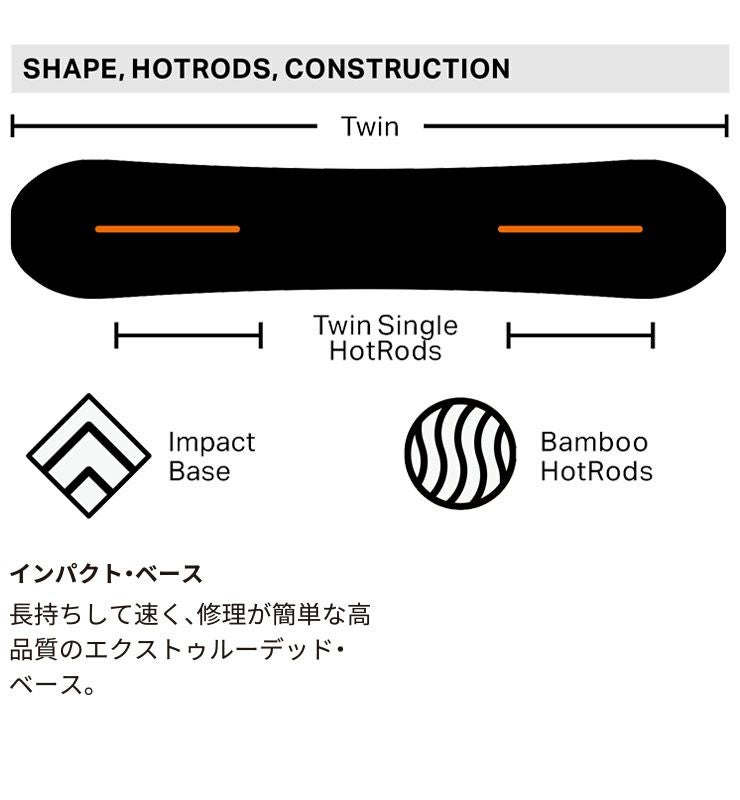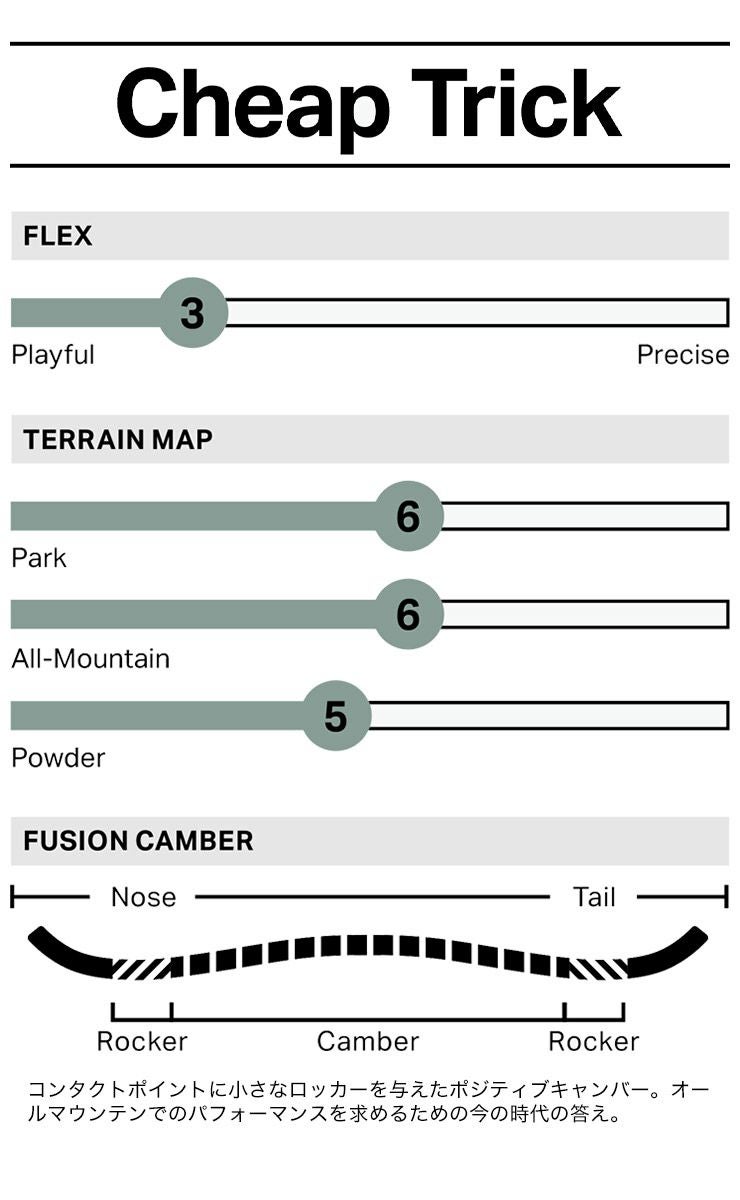 CHEAP TRICKは、初めてのターンからゲレンデのサイドヒットまで対応してくれる、ツインチップシェイプのハイブリッドキャンバーボードです。
