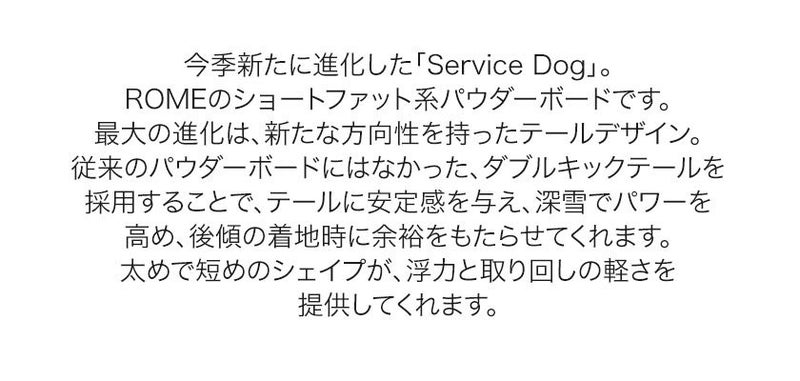 今季新たに進化した「Service Dog」。ROMEのショートファット系パウダーボードです。