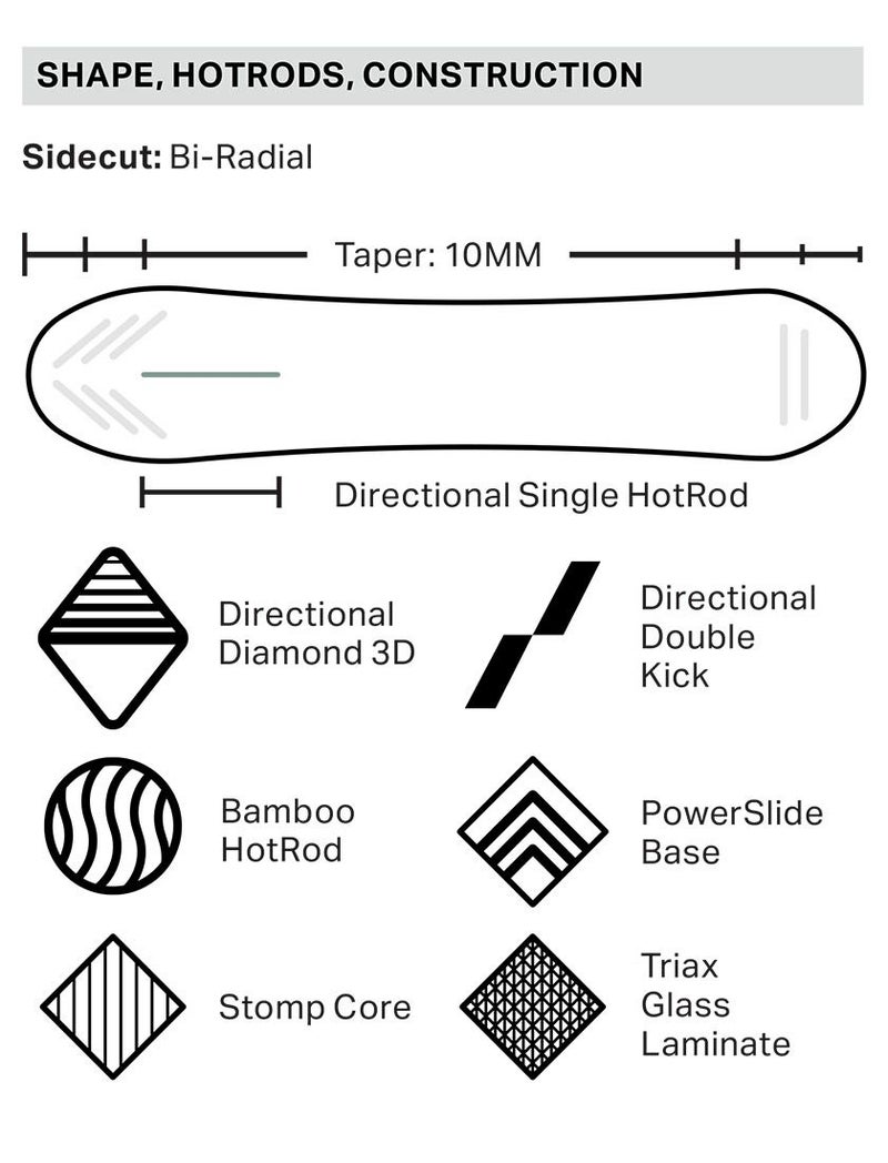 従来のパウダーボードにはなかった、ダブルキックテールを採用することで、テールに安定感を与え、深雪でパワーを高め、後傾の着地時に余裕をもたらせてくれます。