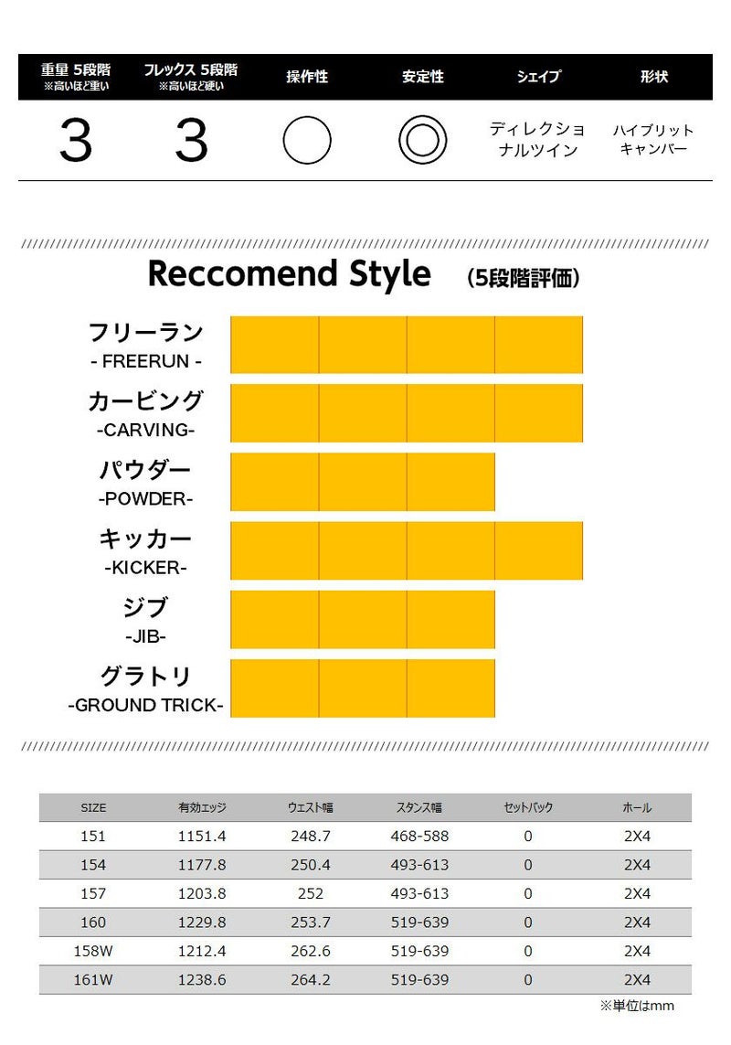 ハイブリッドキャンバーを採用し、カービングやキッカーでの安定性と、地形遊びでの自由度を両立。